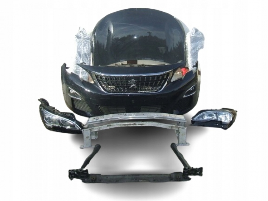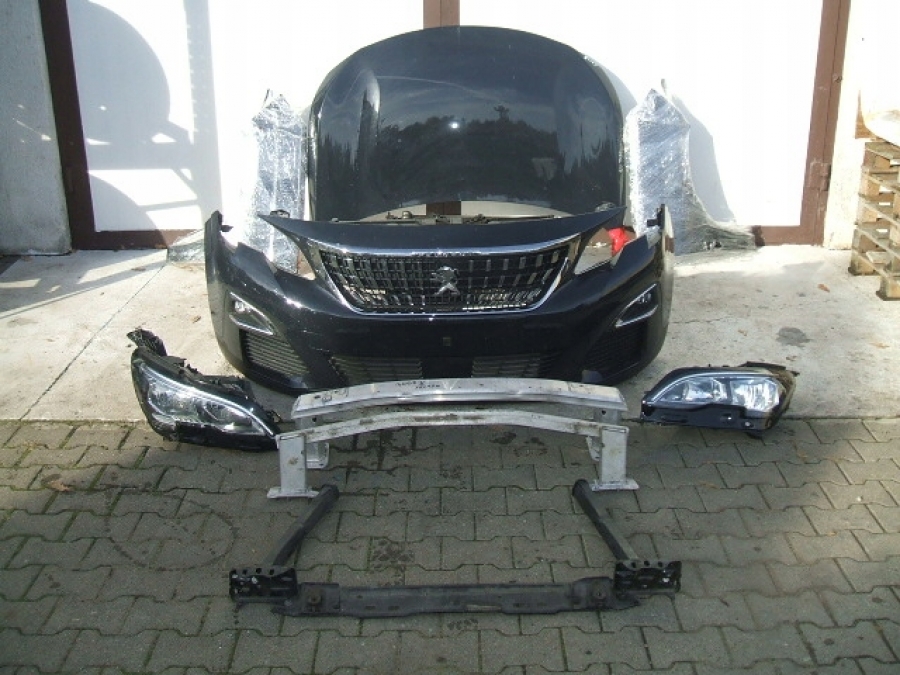 Części przodu (maska, zderzak, błotnik lewy i prawy, lampy europejskie , lewa i prawa , pas przedni chłodnicami) do Peugeota 3008 II . Reflektory w wersji kontynentalnej, NIE angielskiej!